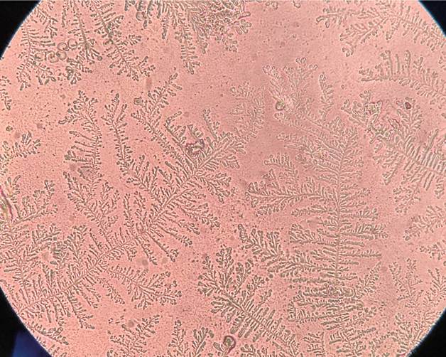 All of this permeability is due to changes in the amount of mucin and water that the cervical fluid contains.  When you are fertile, the cervical fluid has more mucin that form channels allowing sperm through.  Under a microscope, fertile phase cervical fluid shows the strand-like mucins as branches and fern leaf-like structures hence the name a ‘fern test’. The results of the fern test help doctors to confirm ovulation and reveal beautiful patterns as these pictures show.